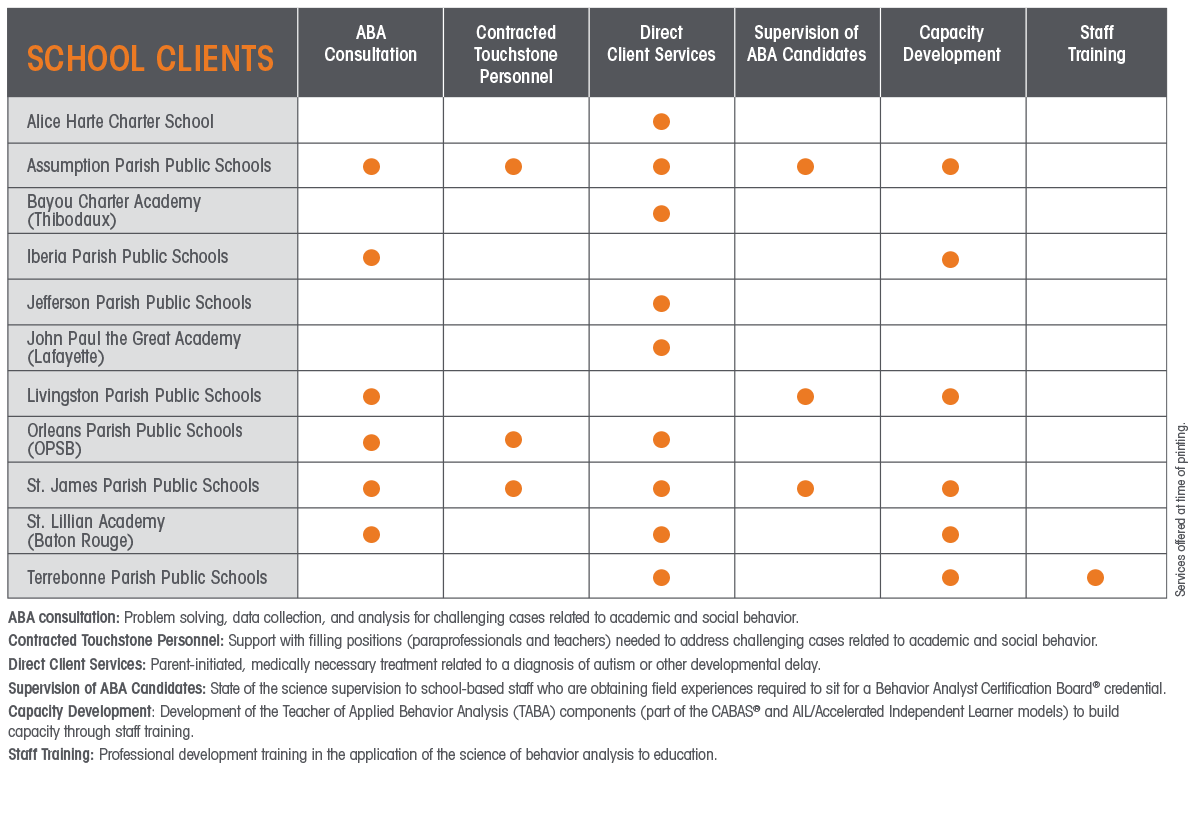 Touchstone is proud to offer its expertise and services to help schools and school systems integrate applied behavior analysis (ABA) into school settings in order to enhance educational outcomes.